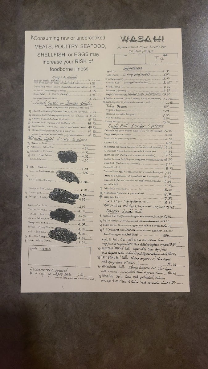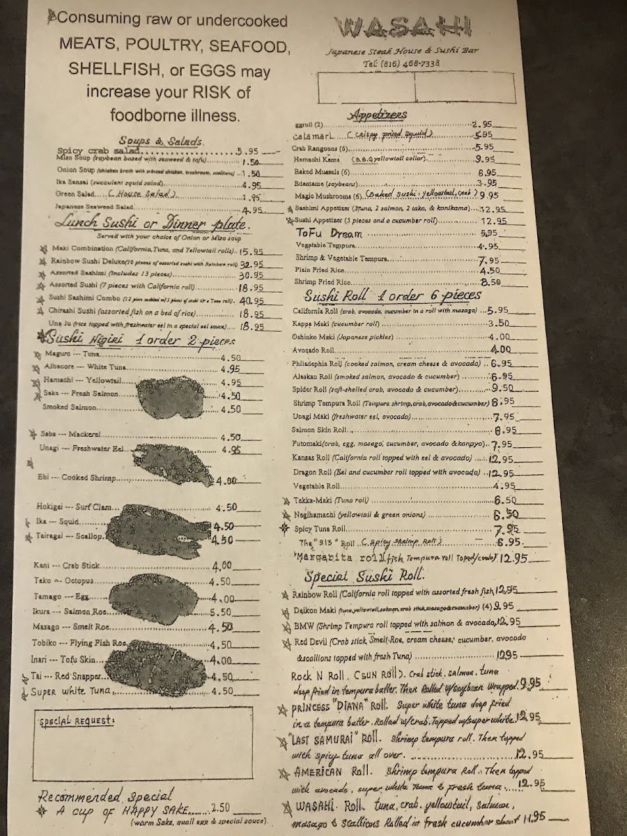 Join us at Wasahi Japanese Steak House & Sushi Bar, your ultimate destination for an unforgettable culinary adventure! Located at 328 NE 72nd St in Kansas City, MO, our menu is a delightful fusion of expertly grilled hibachi dishes and fresh sushi creations that are sure to tantalize your taste buds. Dive into our mouthwatering Steak and Chicken Teriyaki paired with our signature Flaming Onions, or savor the layers of flavor in our bestselling Philadelphia Roll and Volcano Roll. Don’t miss out on crispy Crab Rangoons, delightful Egg Rolls, and the show-stopping Last Samurai Roll. Treat yourself to our delicious hibachi specialties like the Filet & Shrimp Hibachi and indulge in our savory Fried Rice selections. With a variety of options, including Vegetarian Tempura and innovative rolls like the BMW Roll and Spicy Crab Salad, there’s something to please every palate. Come experience the vibrant atmosphere and exceptional dishes at Wasahi, where every meal is a celebration!